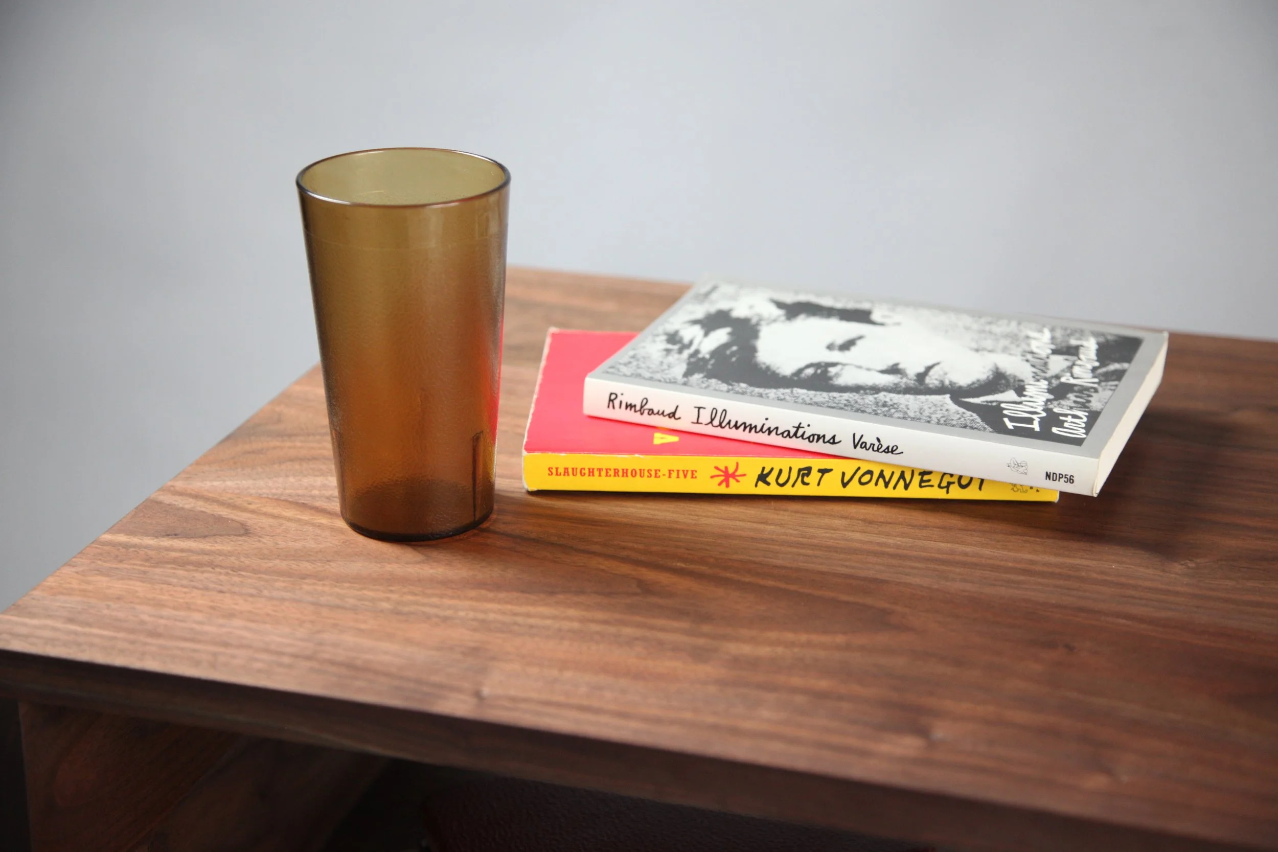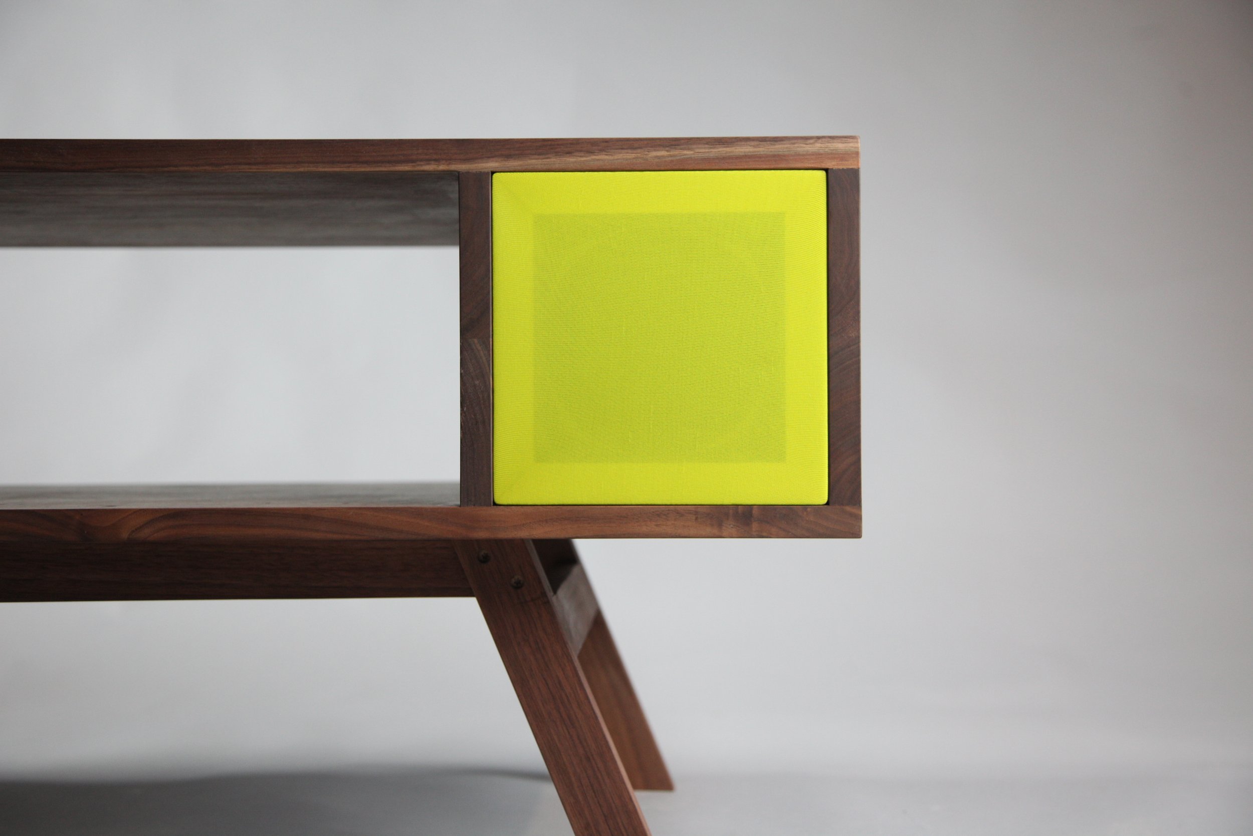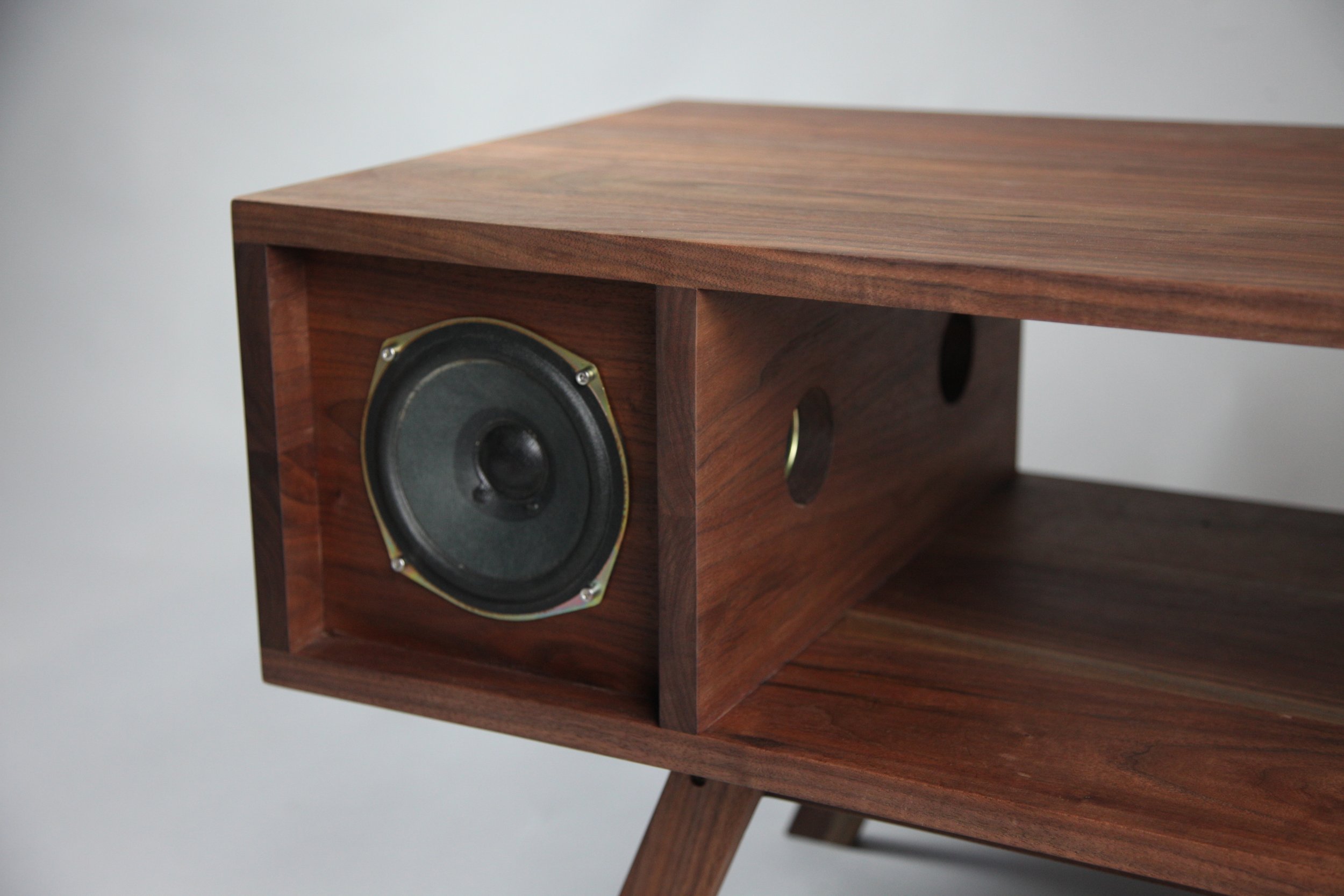 this coffee table features the classic elements of mid century modern design while incorporating new features. notably, two twin woofers are mounted on each side, while two tweeters project lush sound into the open “storage space.” not only does the project boast a built in wired high fidelity sound system, but it also is a 100% functional coffee table, with internal storage for objects of your desire. its solid wood construction is made from decade old walnut boards rescued from a barn in upstate NY